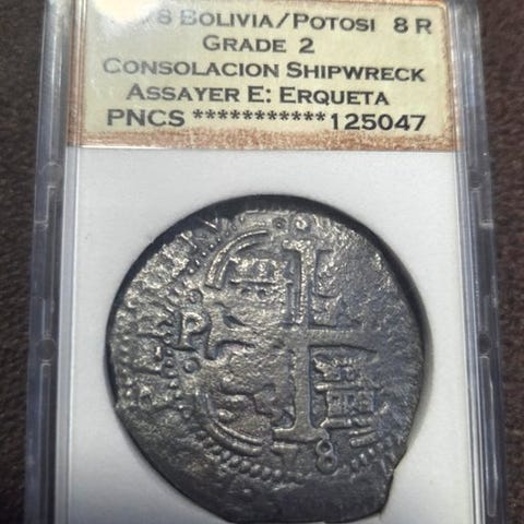 Uforarbejdede mexicanske 8 reales fra skibswrakket Akerendam (VOC), sunket ved Norge i 1725, i sølv, certificeret af NGC, med en træudstillingsboks og hæfte. Klik på den blå "gå til varen" knap, for at købe eller byde på denne vare. Den samlede pris vil blive vist inden du afgiver dit bud.