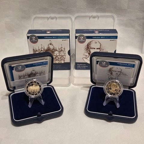 Tre San Marino 2-euro mønter fra 2025, Michelangelo (Proof Inverse), Michelangelo (Coincard) og Giubileo (Coincard), alle i ubrugt stand. Klik på den blå "gå til varen" knap, for at købe eller byde på denne vare. Den samlede pris vil blive vist inden du afgiver dit bud.