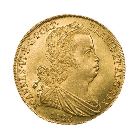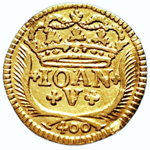 Guld Quartinho (1.200 Reis) fra kolonit Brasilien, 1726 i Rio de Janeiro under D. João V, vægt 2,28 g, diameter 17,87 mm, fineness 916,6, ikke bedømt. Klik på den blå "gå til varen" knap, for at købe eller byde på denne vare. Den samlede pris vil blive vist inden du afgiver dit bud.