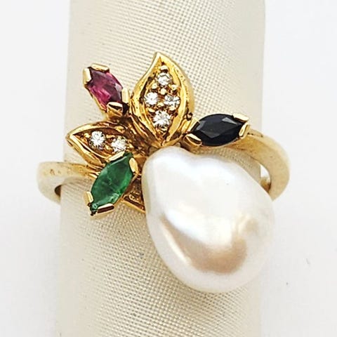 Ring med 4,09 g og med 6 brillantslebne diamanter på 1,0 mm og 0,03 ct, 1 rubin på 0,01 ct, 1 safir på 0,01 ct med en samlet vægt på ca. 0,01 ct, og 1 smaragd på 0,01 ct. Samlet vægt ca.