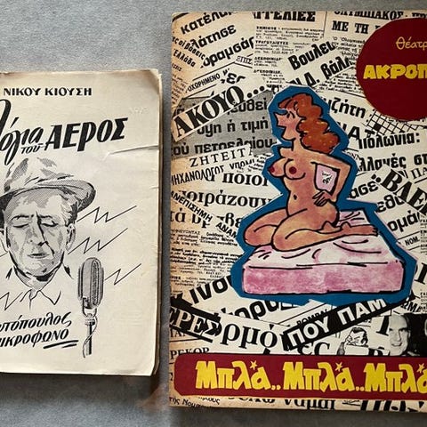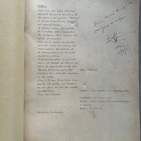 Et sjældent og samlerobjekt af to originale vintage græske teaterprogrammer, begge førsteudgaver og håndsigneret af den legendariske skuespillerinde Tzeni (Jenny) Karezi. Disse programmer dokumenterer banebrydende sceneforestillinger instrueret af Kostas Kazakos, en af Grækenlands vigtigste teaterfigurer efter krigen.