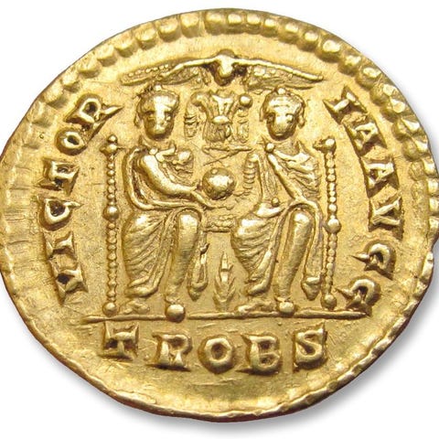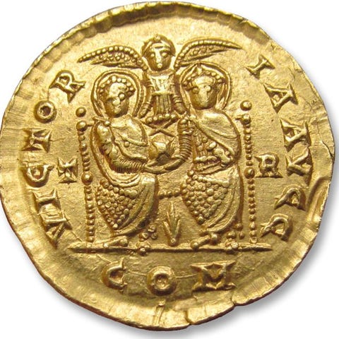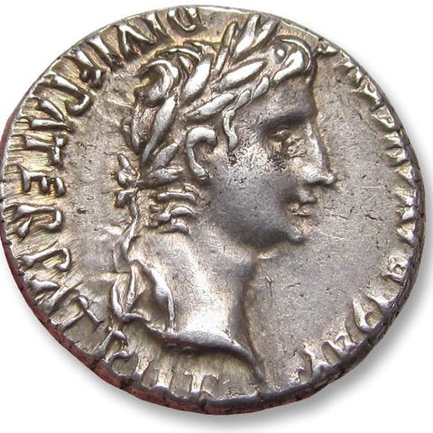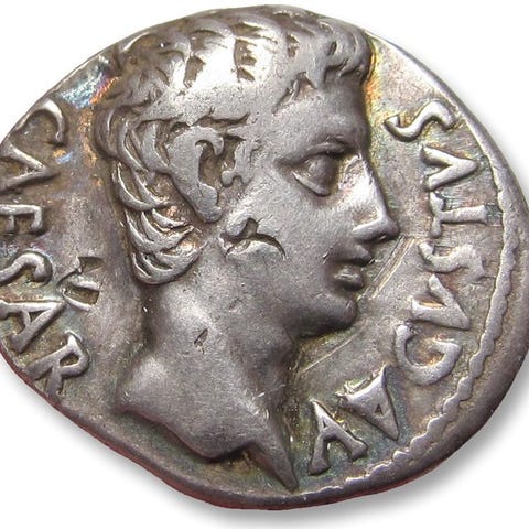 Reverse: ABVNDANTIA AVG, Abundantia står til højre, tømmer frugter ud af hornkøen.
