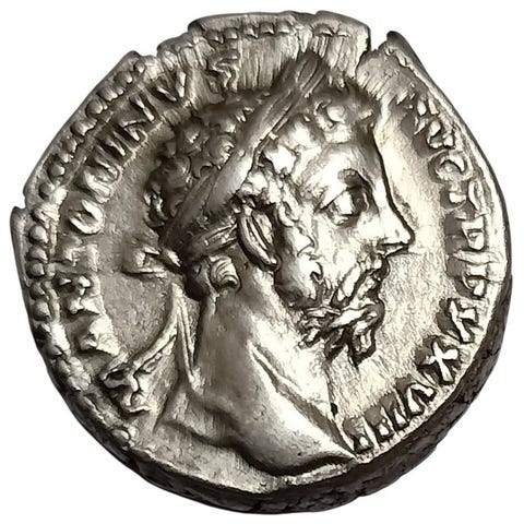 Rev.: P M TR P VIIII COS III P P: Sol, strålende, nøgne undtagen kappe over skuldrene, stående til højre, hoved til venstre, løfter højre hånd og holder globus i venstre.