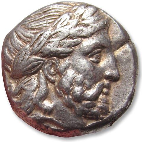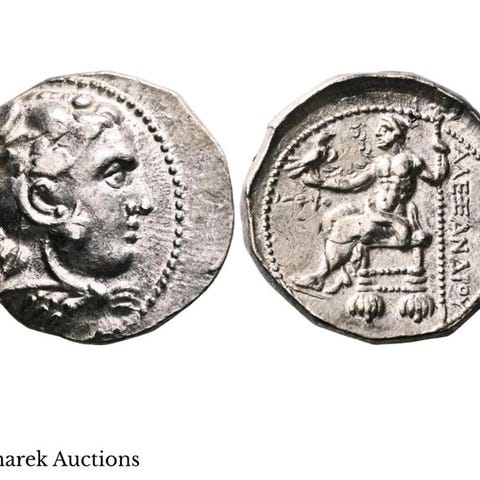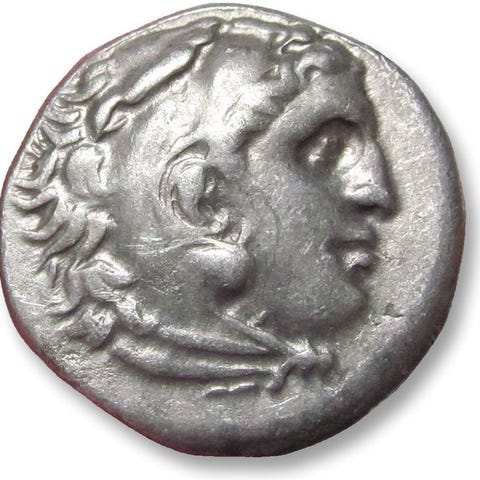 AR sølv tetradrachm fra kongerne af Makedonien, Arados omkring 324–320 f.Kr., i navnet og typerne af Alexander III – levetid / tidlig posthum udgave; obverse: Herkules til højre iført løvepels, reverse: Zeus Aëtophoros siddende til venstre; Λ i venstre felt, AP monogram under tronen; vægt 16,68 g, diameter 27 mm, VF+ med let toning og prøveklip på bagsiden. Klik på den blå "gå til varen" knap, for at købe eller byde på denne vare. Den samlede pris vil blive vist inden du afgiver dit bud.