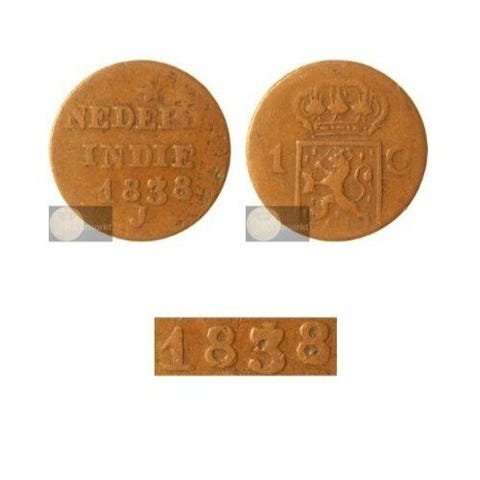 Belgiske 2 centimes z.j. (1833-1865) inskriberet, hvor forsiden er et spejlbillede af bagsiden, fordi der har siddet en ekstra mønt fast på stemplet.
