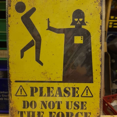 Star Wars Baby Yoda metal toilet sign med teksten 'Flush You Must'. Skiltet er designet til at hænge på væggen og bruges som dekoration til badeværelset. Måler 20x30cm