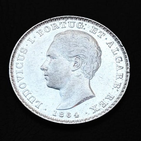 Portugal, sølv Tostão (100 reis) udstedt under D. João VI (1816–1826); ND – Meget sjælden, flot patina, AG 09.01, Vægt 2,92 g, Diameter 21,89 mm. Klik på den blå "gå til varen" knap, for at købe eller byde på denne vare. Den samlede pris vil blive vist inden du afgiver dit bud.
