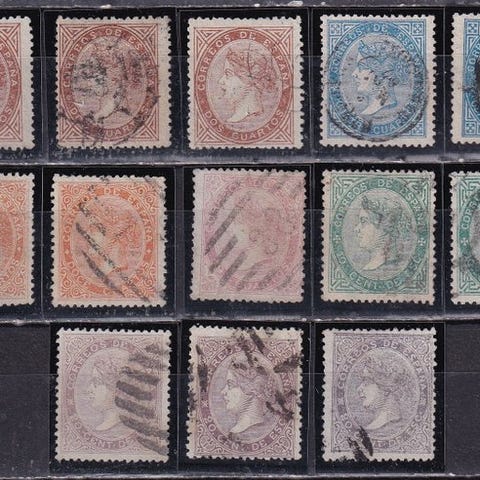 Frimærker af 12 lilla kvartører og 5 Reales røde fra 1850, stemplet med sort edderkop.
