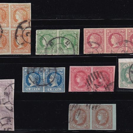 Spanien, Isabel II. 12 Cuartos Lilla og 5 Reales Rød, fra 1850, frankeret med en sort spinder, Edifil 2 og 3. Klik på den blå "gå til varen" knap, for at købe eller byde på denne vare. Den samlede pris vil blive vist inden du afgiver dit bud.