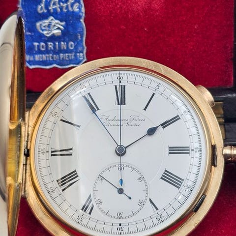 Jules Grumbach IBIS 14K Grand Komplikation med kalender, månefase, kronograf og kvart-repetition, Schweiz omkring 1890, håndoptræk, guldfarvet kasse over 50 mm i diameter, vægt 131,2 g, i funktion og i meget god stand med mindre slid. Klik på den blå "gå til varen" knap, for at købe eller byde på denne vare. Den samlede pris vil blive vist inden du afgiver dit bud.