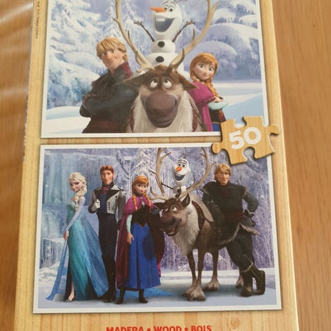 Frozen Puzzle Double - Face, puslespil, andet spil, 2 in 1 ( 2 puslespil i æsken) 1 på 60 brikker og 1 på 108 brikker - 50 x 35 cm. Det er dobbeltsidet, det vil sige, at barnet kan farvelægge figurerne, og også samle dem. Puslespillet fremstår som nyt - til børn fra 4 år.