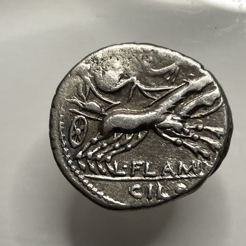 Rev: ROMA. Jupiter i langsom firehestekøretøj mod højre, holder tordenkile i venstre hånd og palmegren i højre.