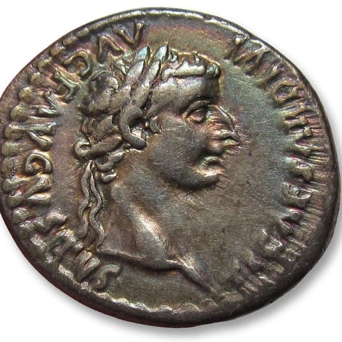 Romersk Rige sølvdenar fra Colonia Patricia (Corduba) ca. 19 f.Kr. under Augustus, 3,61 g, 19 mm, VF+ med flere bankersmærker og stærk toning; obverse CAESAR AVGVSTVS bar ansigt til højre, reverse OB CIVIS SERVATOS inden for egetræskrans. Klik på den blå "gå til varen" knap, for at købe eller byde på denne vare. Den samlede pris vil blive vist inden du afgiver dit bud.