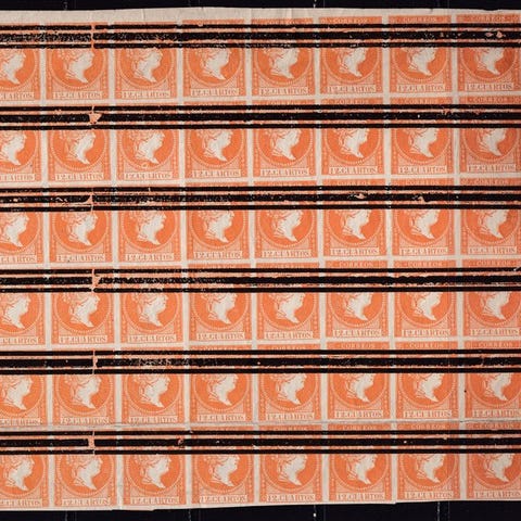 10 reales, grøn. Brugt. Fulde margener. Sjælden. Vandret fold.