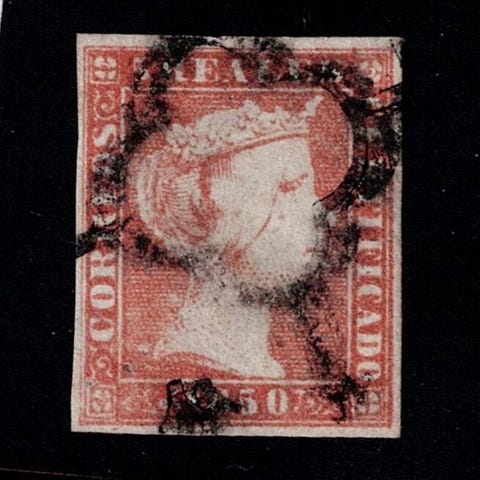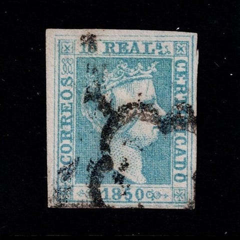 Spanien; Isabel II. 10 reales, grøn, brugt, fra 1850, Edifil 5, fuldstændige margener, sjælden med vandret buk. Klik på den blå "gå til varen" knap, for at købe eller byde på denne vare. Den samlede pris vil blive vist inden du afgiver dit bud.