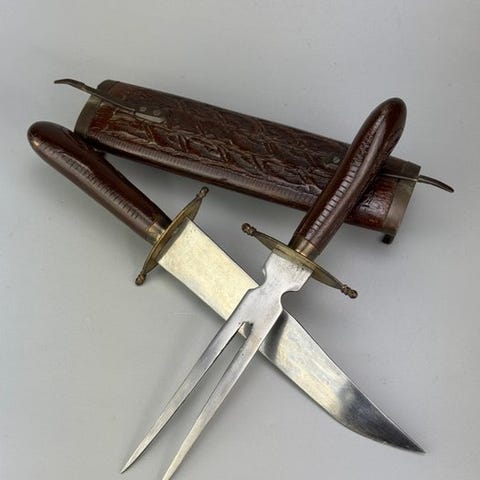 Sjældent og spektakulært sæt af kolonialbord i finhøvlet valnøddetræ eller sheesham, der er omhyggeligt udskåret og forestiller en påfugl med udbredte vinger, som udgør støtte til knivene.