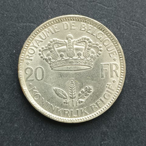 Belgien. 20 Francs 1934. Monnaie fautée : axe des coins décalé