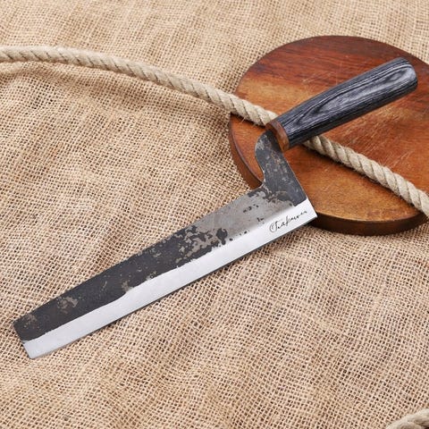 Bladet har en rustik, lidt hamret tekstur, typisk for knive lavet af højcarbonstål, ofte brugt i japansk håndværk. Det ser ud til at være blevet smedet for hånd med et mønster, der både kan give æstetisk appel og styrke.
