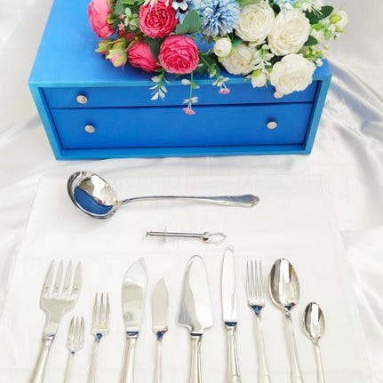 Leg med skabsskuffer - halvdel af det 20. århundrede - Fremragende stand. Sølvarbejde L.C.F. (Le Couvert Français) i tykt, højkvalitets sølvbelagt metal 'Métal Blanc', med blanke håndtag og kontrasterende skærende kanter. Fuldt sæt - til 12 service. I fremragende stand -! Alle bestikket er stemplet med smedens stempel med initialer og dets emblem, skjold med krone.