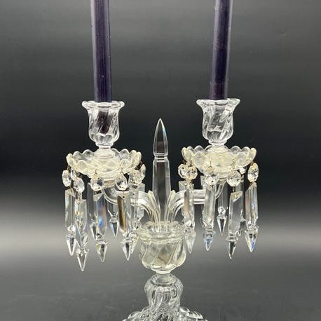 To smukke lysestager fra Maison Baccarat i krystal, hver dekoreret med et dyremotiv. En bjørn i sølvfarvet metal til den ene, en snegl i guldfarvet metal til den anden.