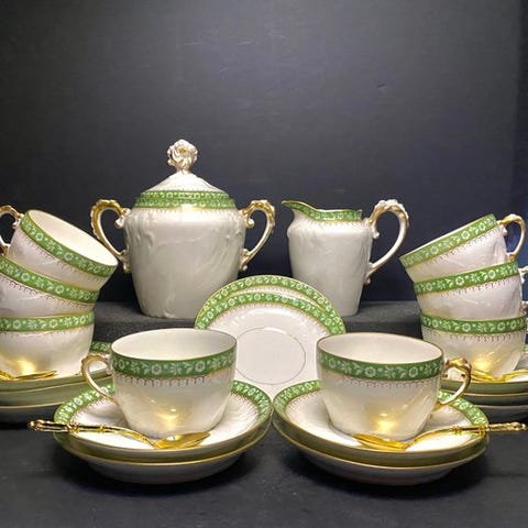 Servicen fremhæver den fine porcelæn fra Limoges, dekorerne er raffinerede, og jeg inviterer dig til at se grundigt på billederne.