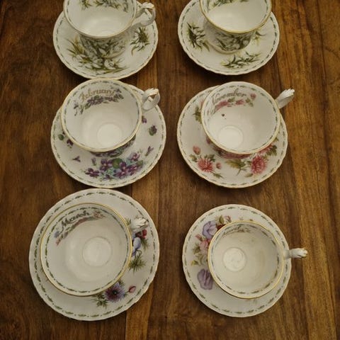 Den består af 6 kopper - 6 underkopper - 6 tefade - en sukkerskål