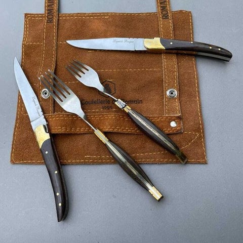 Smukt ekstra stort Laguiole lommesæt 18 cm af oliventræ i smuk kasse.