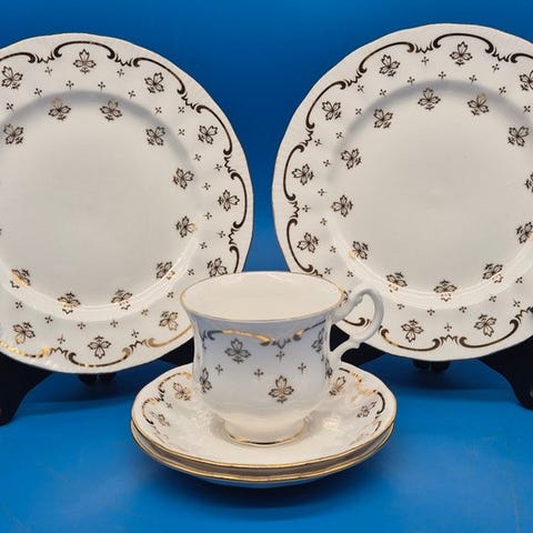 Til salg står et fint Bone-China-teenservice fra den engelske manufaktur Royal Standard, dekoreret med fine blå-weiße blomsterbånd og klassisk guldrand. Servicen omfatter to tallerkener, to underkopper og to tekopper og præsenterer den typiske elegante formgivning for Royal Standard.