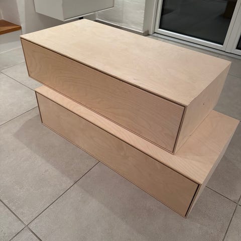 Har været brugt som underlag til seng på børneværelse. Nu blot stablet midlertidigt som kommode.