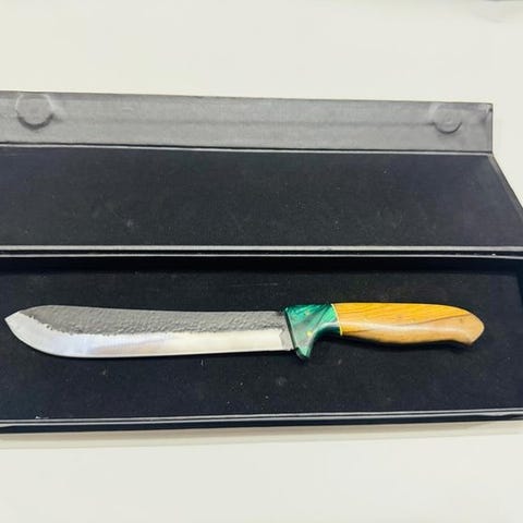 Kniven præsenteres i en beskyttende transportkasse, hvor bladet er sikkert fastgjort i