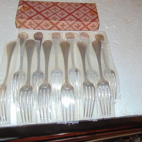 Sæt af 12 fiskegafler fra Christofle, model Rubans, i sølvplet.