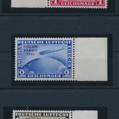 Legendarisk polarfart med LZ 127 Graf Zeppelin 1931, komplet på to kort og et brev. 1RM på Hugo Eckener-kort med bordpoststempel, 2RM på luftskibs-kort med bordpoststempel, og 4RM på brev (på brev altid søgt) fra Friedrichshafen til isbryderen Malygin og videre til USA. Michel Zeppelin-katalog nr.: 204, 1.200 euro, se billeder, disse er en del af beskrivelsen.