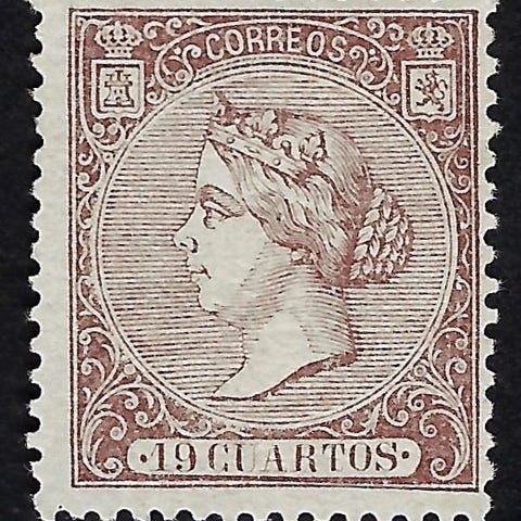 Spanien, Isabel II 19 cuartos castaño y rosa, Edifil 71, MNG (uden gum), certificeret CEM. Klik på den blå "gå til varen" knap, for at købe eller byde på denne vare. Den samlede pris vil blive vist inden du afgiver dit bud.