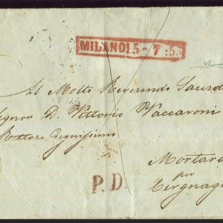 Postforsendt brev fra Antikke Italienske Stater – Sicilien, 1859, frankeret med tre 2-grana frimerker fra 2. plade (positioner 28–30), med adresse og tydelig afsæløgning; Sassone 7a katalogisering med L. Gazzi’s underskrift og Alberto Diena historisk certifikat. Klik på den blå "gå til varen" knap, for at købe eller byde på denne vare. Den samlede pris vil blive vist inden du afgiver dit bud.
