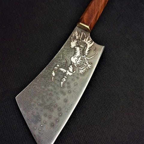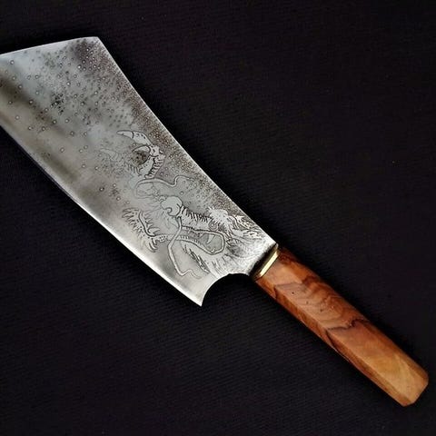 Håndtaget er lavet af Wistaria træindlæg og har rustfrit stål bolstre.