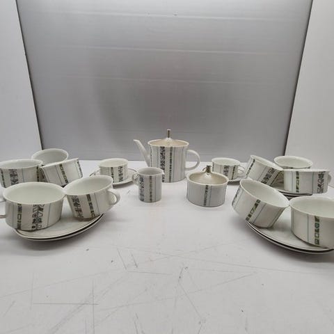 Til salg er et elegant kaffeeservice fra Porzellanmanufaktur Selb i Rosenthal-gruppen, fremstillet af fint hvidt porcelæn med reliefdekoration og en fin, håndlavet rosedekoration i harmoniske grønne og rosa nuancer. Formen viser den typiske klassiske linjeføring for Selb med guldfarvet kantdetalje.