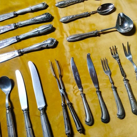 Sølvplet bestiksæt fra 60'erne, Italien, i fremragende stand, minimal oxidation, 51 dele, sølvbelagt. I originalemballage. Sættet består af 12 gafler, 12 skeer, 12 knive, 12 teskeer, 1 suppeske, 1 serveringsgaffel, 1 serveringsske. Mål på æsken: 48,5 x 32,5 x 6,5 cm, samlet vægt 4 kg.