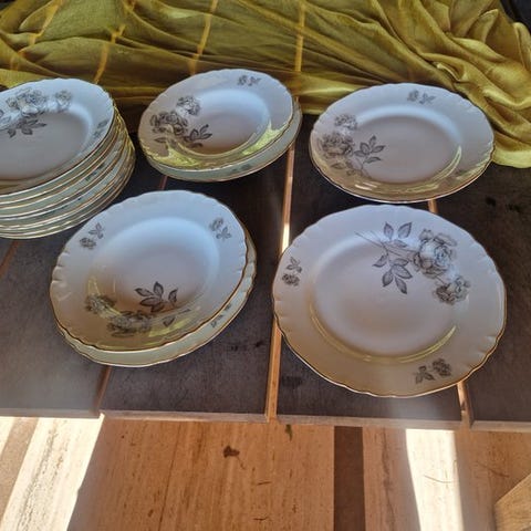 Sæt af 12 tallerkener fra Richard Ginori, fremstillet i Italien i anden halvdel af 1900-tallet. I hvid pasta porcelæn med dekoration, hver tallerken med scener af jagtdyr.