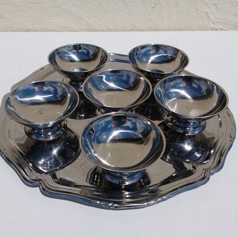 Vintage sæt med 12 isbægre, frugt, creme, dessert, alkohol, smagning, amuse bouche, hovedret, tallerken, ladeplade, skåle, underkopper, bordserviet, glas, champagne.
