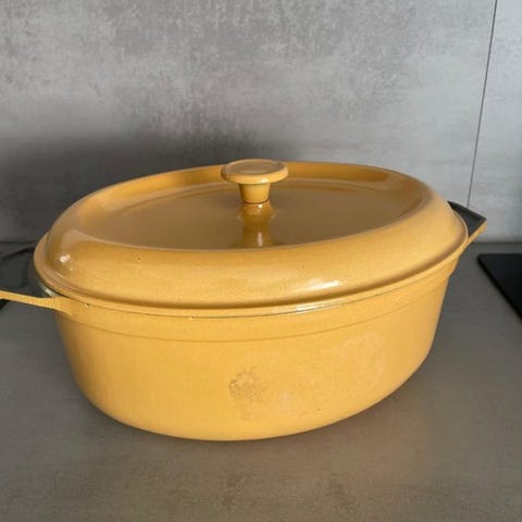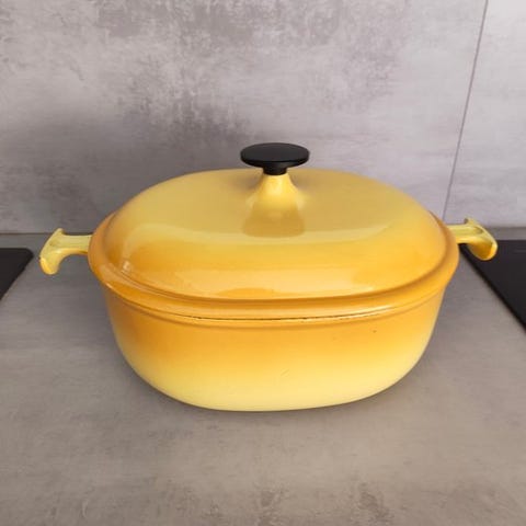 Her er et meget sjældent vintage-stykke. Denne model blev også kaldt 'soucoupe volante'. Denne gryde er en spektakulær kreation af Raymond Loewy, som også har designet køkkenredskaber til Le Creuset.