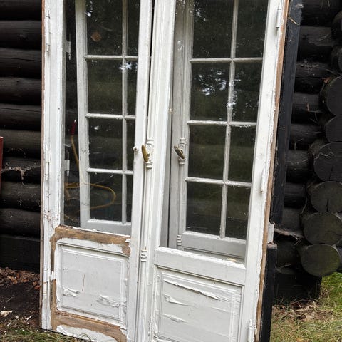 Smuk, dobbelt havedør (eller terrassedør) med 8-ruders vinduespartier i hvert dørblad. Småsprossede ruder med kittet glas (én rude mangler og kan evt isættes ved køb).