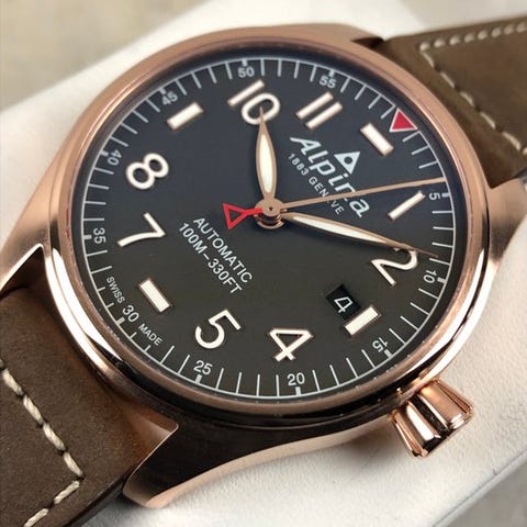 Alpina Startimer Pilot Automatic AL-525BR4S24, 41 mm rustfrit stål urkasse med rosaguld belægning, mat brun skive, schweizisk automatisk urværk Alpina caliber AL‑525, beige tekstilrem, nytilstand, med original rejseæske og forsikret forsendelse. Klik på den blå "gå til varen" knap, for at købe eller byde på denne vare. Den samlede pris vil blive vist inden du afgiver dit bud.