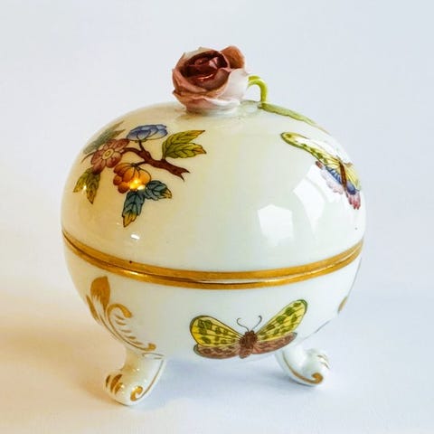 Design 'Queen Victoria': Dekoren har en farverig sommerfugl, et dekorativt motiv fra serien 'Queen Victoria' af Herend, en af de mest ikoniske og genkendelige for mærket. Dette design er inspireret af en porcelænsservice lavet til dronning Victoria af England i 1851, under den Store Udstilling i London.