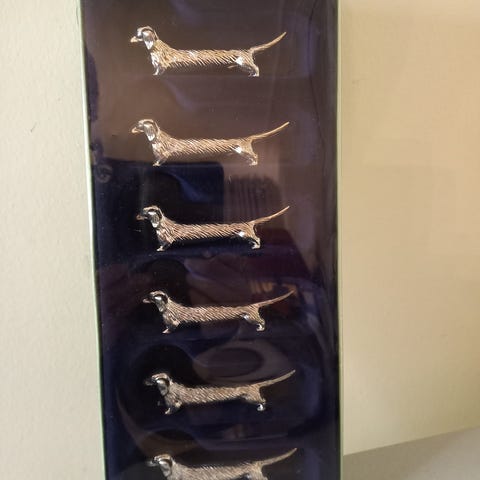 Fremragende sæt af seks antikke knivstøtter med forestillende gravhunde, fint støbte og detaljerede.