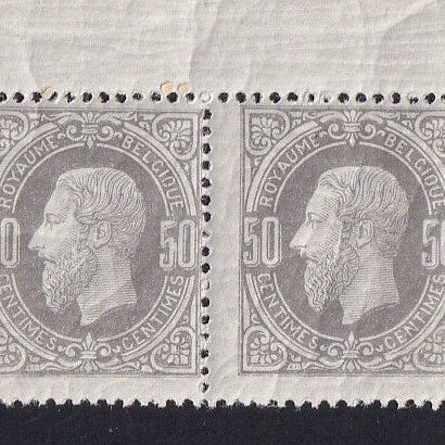 Belgisk frimærke fra 1869–1883, Leopold II-udgaven 50c Koolzwartgrijs med sjælden farvenuance og pæn centrering, ubrugt uden gum (OBP/COB 35b). Klik på den blå "gå til varen" knap, for at købe eller byde på denne vare. Den samlede pris vil blive vist inden du afgiver dit bud.