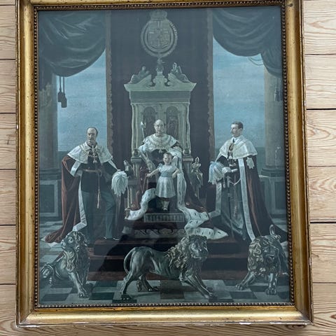 Tryk, Familie Journalen År 1900, motiv: De fire konger: . , b: 49 h: 66, Christian den 9, Fredrik den 8, Christian den 10, og Fredrik den 9.Motiver er fra riddersalen på Rosenborg. Det specielle ved dette kunstværk er, at løverne er spejlvendt!