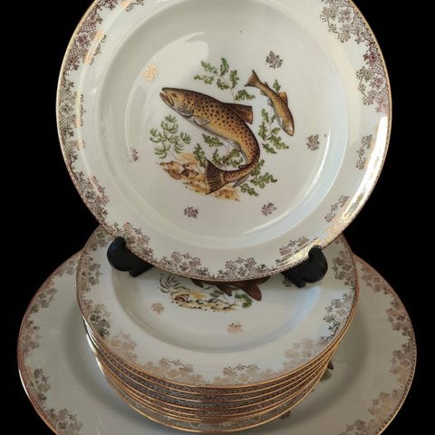 Superb service i fransk porcelæn - Sologne-Lamotte, med smukke illustrationer af vilde dyr: hjorte, ænder, fasaner, harer. Stykkerne er pyntet med en gylden kant, der giver en smuk finish.