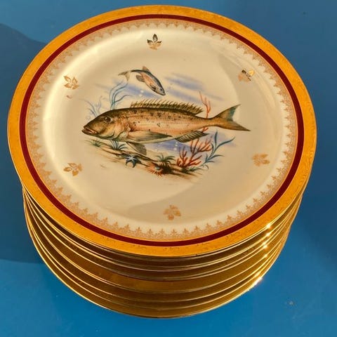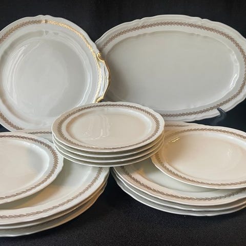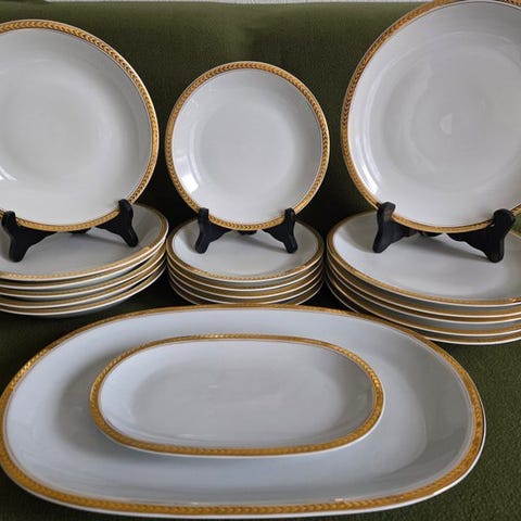 Superb sæt med 20 stykker i fin porcelæn signeret Compagnie Nationale de porcelaine (CNP), dekoreret med en elegant gylden kant med stiliserede bladmotiver. En raffineret service, ideelt til et klassisk bord eller en samling af fransk porcelæn.