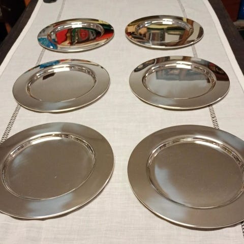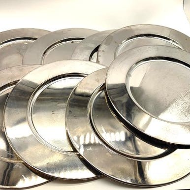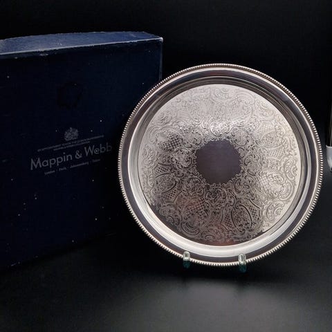 Sottopentole. Ingen mærke. Sandsynligvis lovlig, da den ikke viser nogen lækage. Smuk indgravering. Rund, 28 cm i diameter. Gennem to skydere kan den blive længere, op til 40 cm. Meget flot til et elegant bord. Fire ben i bakelit gør den termisk isoleret. Fremragende stand. Skal rengøres.
