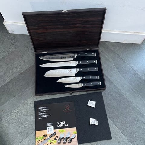 Dette er et håndlavet 3-delt køkkenknivsæt med lagdelte Damascus-stålblade og resin-håndtag. Hver kniv er individuelt smedet, hvilket tydeligt viser Damascus-mønstre og giver god balance og skæreevne.